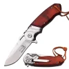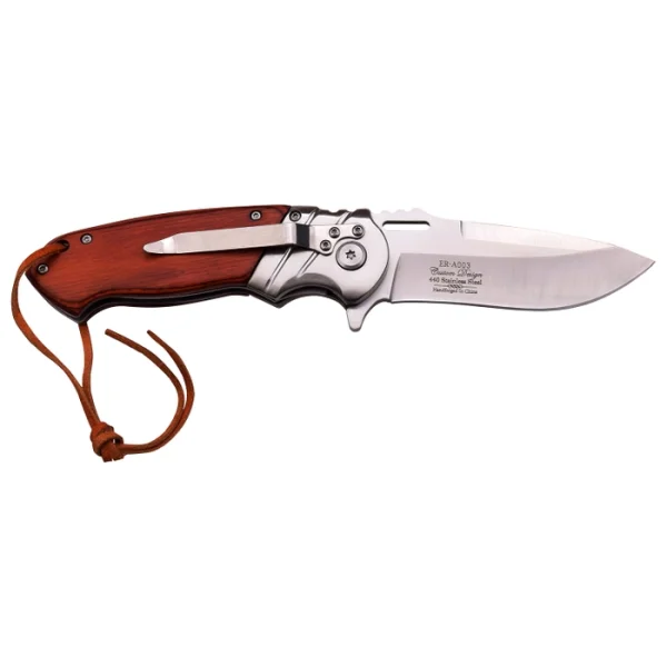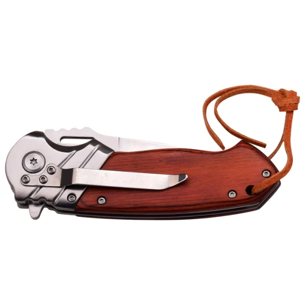 - SPECIAL FEATURES: Spring Assisted Folding Knife, Brown Wood Handle with Stainless Steel Bolster and Leather Lanyard, Pocket Clip.