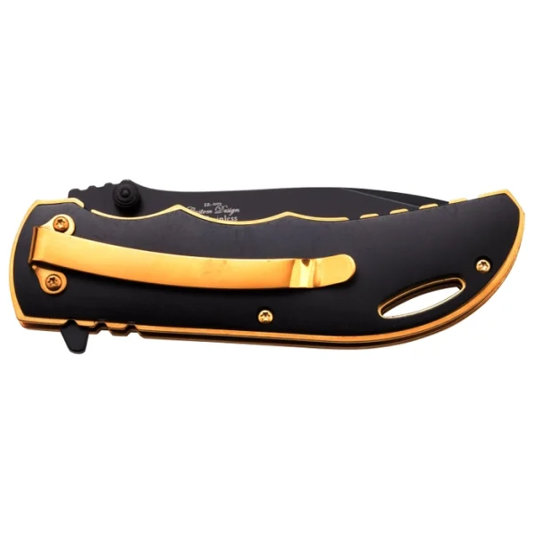 - SPECIAL FEATURES: Spring Assisted Knife, Gold Stainless Steel Handle with Black Overlay, Gold TiNite Coated Pocket Clip.