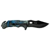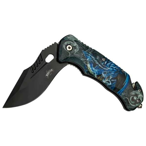 - SPECIAL FEATURES: Spring Assisted Open, Finger Flipper, Liner Lock, Black Oxidized Stainless Steel Blade, Injection Molded ABS Handle with Embossed Blue Dragon Design, Rope Cutter, Glass Punch and Pocket Clip.