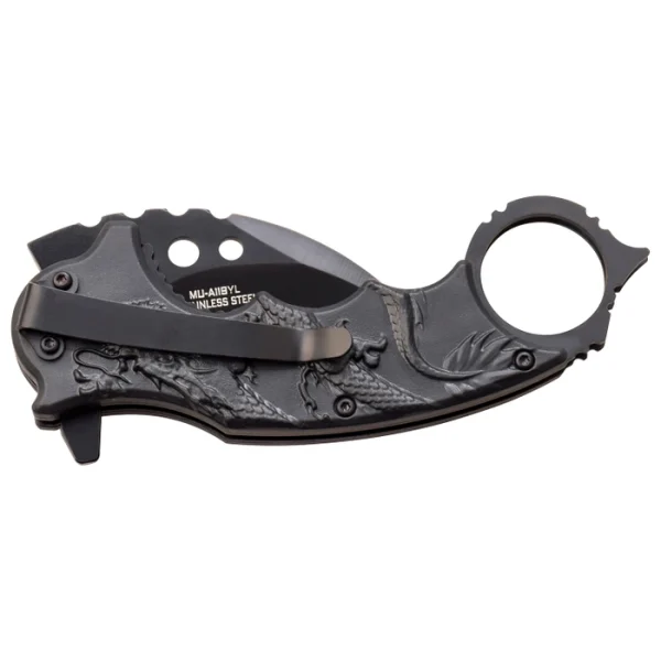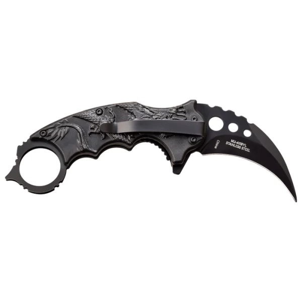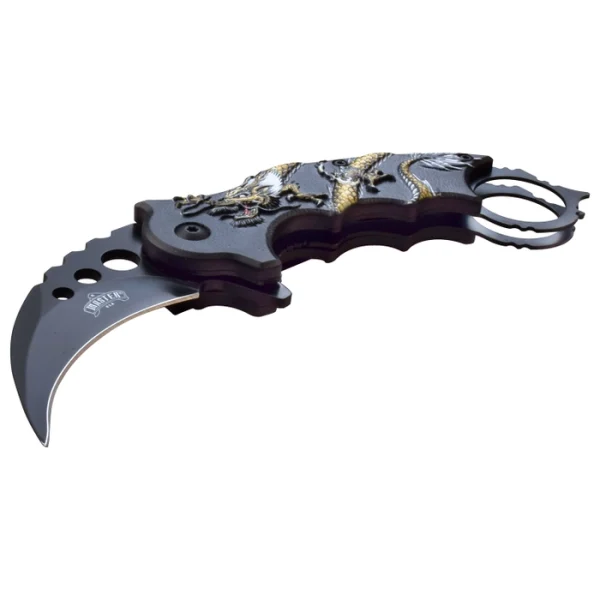 - SPECIAL FEATURES: Spring Assisted Open, Finger Flipper, Liner Lock, Black Oxidized Stainless Steel Karambit Blade, Injection Molded ABS Handle with Sculpted Yellow Dragon, Glass Punch and Pocket Clip.