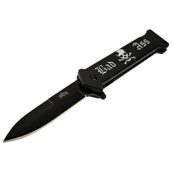 - SPECIAL FEATURES: Spring Assisted Open, Finger Flipper, Liner Lock, Black Oxidized Stainless Steel Blade, Injection Molded ABS Handle with Embossed “Bad Ass” Graphic and Pocket Clip.