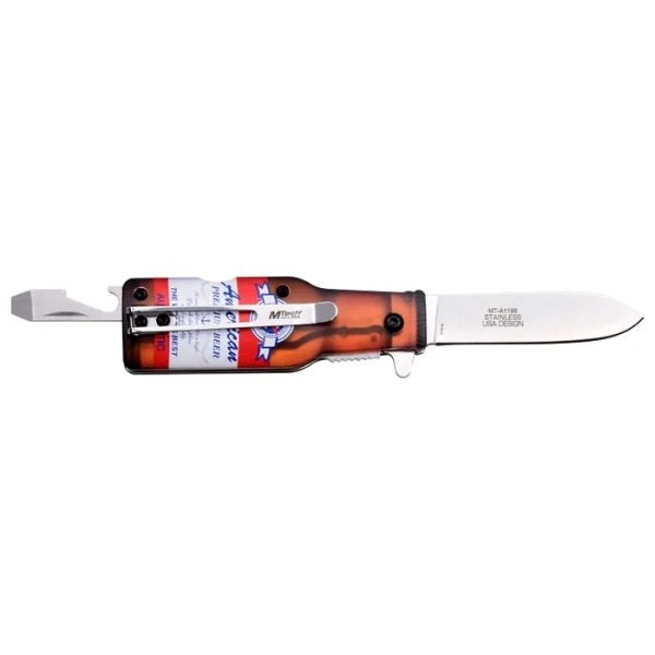 - SPECIAL FEATURES: Spring Assisted Open Folding Knife – Worlds First Standing Pocket Knife! Stands on Its Own! Satin Finish Stainless Steel Blade, Liner Lock, ABS Handle with American Beer Artwork in Shape of Bottle, Includes Bottle Opener, Flat Head Screwdriver and Pocket Clip.