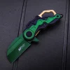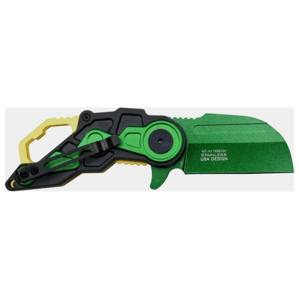 - SPECIAL FEATURES: Green Stainless Steel Wharncliffe Blade, Green, Black and Gold ABS Handle with Bottle Opener, Liner Lock and Pocket Clip.