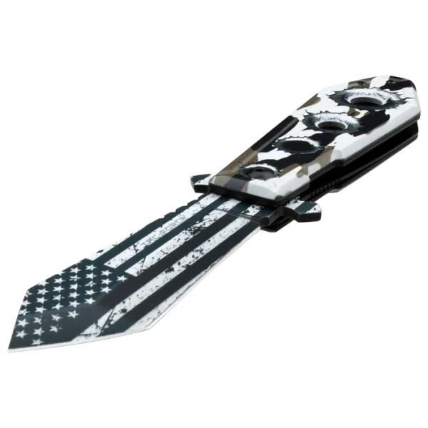 - SPECIAL FEATURES: Spring Assisted Folding Knife – Fine Edge Stainless Steel Blade with US Flag Graphic, Aluminum Handle with Camo Graphic, Liner Lock and Pocket Clip for Easy and Safe Carry.