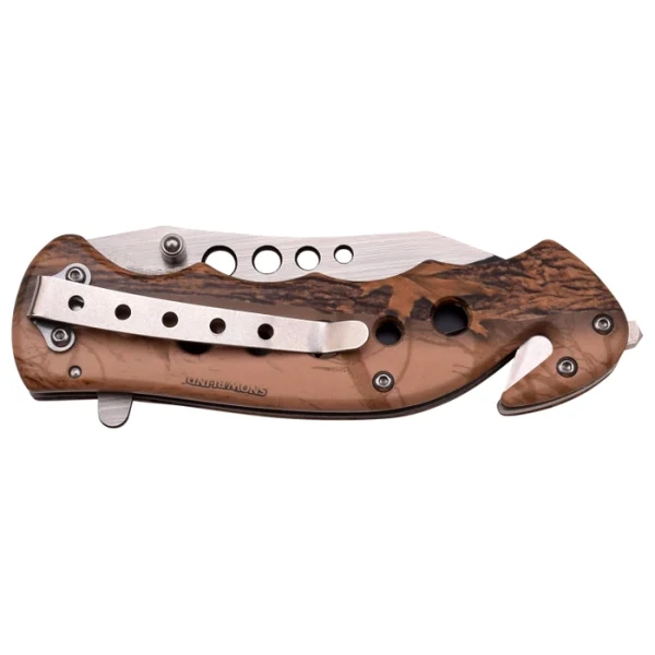 - SPECIAL FEATURES: Spring Assisted, Finger Flipper, Liner Lock, Brown Fall Camo Coated Aluminum Handle, Rope Cutter, Glass Punch, and Pocket Clip.
