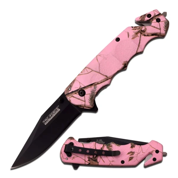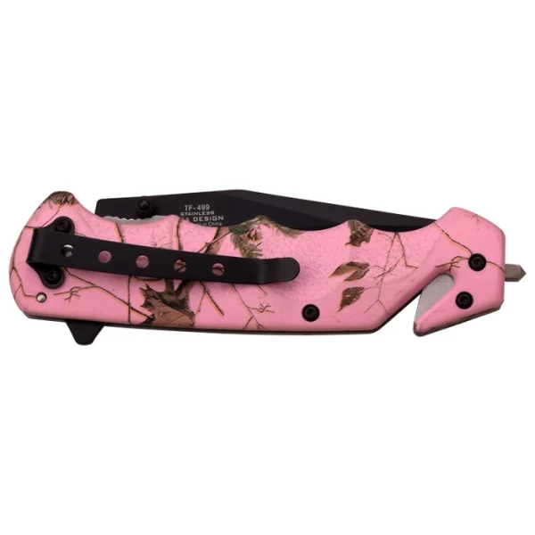 • SPECIAL FEATURES: Spring Assisted, Finger Flipper, Liner Lock, Light Pink Forest Camo Coated Aluminum Handle with Textured Finger Contour, Rope Cutter, Glass Punch, and Pocket Clip.