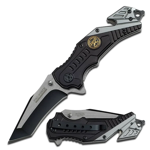 - SPECIAL FEATURES: Spring Assisted, Finger Flipper, Liner Lock, Black and Grey Aluminum Handle with Sniper Medallion, Rope Cutter, Glass Punch and Pocket Clip.