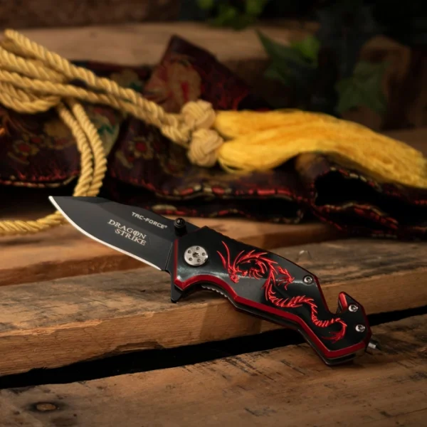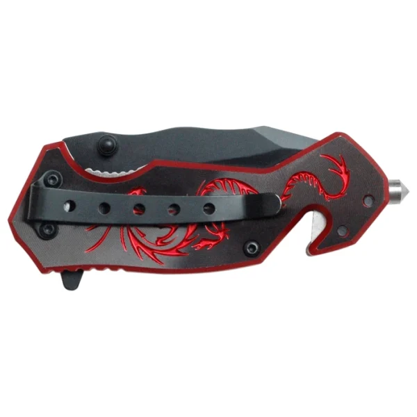 - SPECIAL FEATURES: Spring Assisted, Finger Flipper, Liner Lock, Black Aluminum Handle with Red Dragon, Rope Cutter, Glass Punch and Pocket Clip.