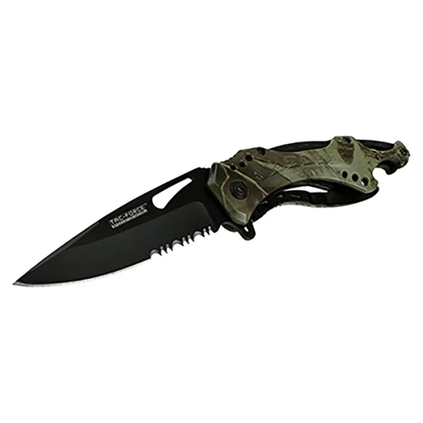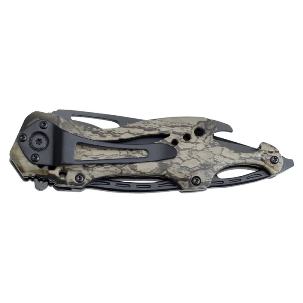 - SPECIAL FEATURES: Spring Assisted, Finger Flipper, Blade Cut Out, Pocket Clip, Grey Camo Coated Aluminum Handle with Black Stainless Steel Liner, Liner Lock, Glass Punch, Bottle Opener.