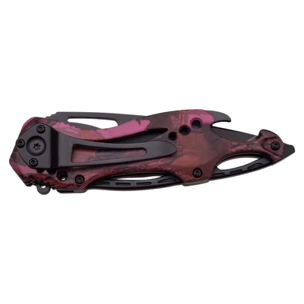 - SPECIAL FEATURES: Spring Assisted, Finger Flipper, Blade Cut Out, Pocket Clip, Purple Camo Coated Aluminum Handle with Black Stainless Steel Liner, Liner Lock, Glass Punch, Bottle Opener.