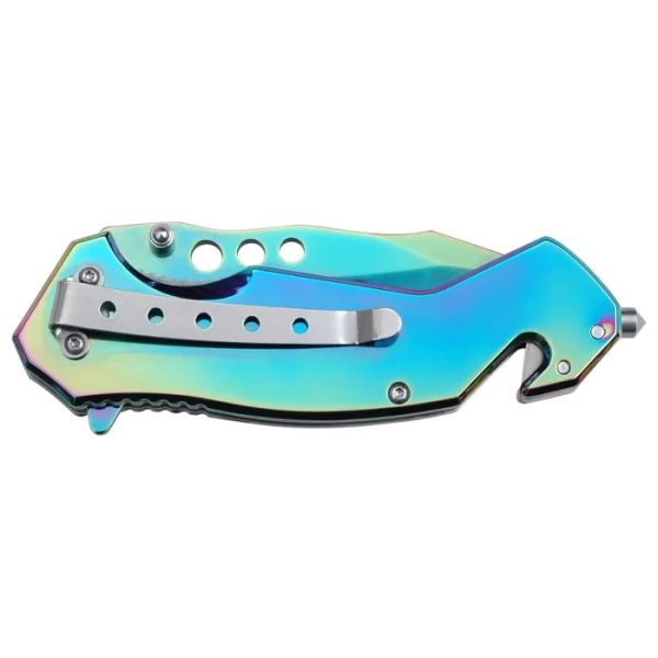 • SPECIAL FEATURES: Spring Assisted, Finger Flipper, Liner Lock, Rainbow TiNite Coated Stainless Steel Handle with Etched Dragon, Rope Cutter, Glass Punch, and Pocket Clip.