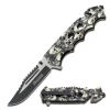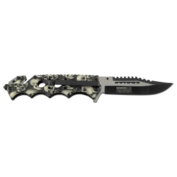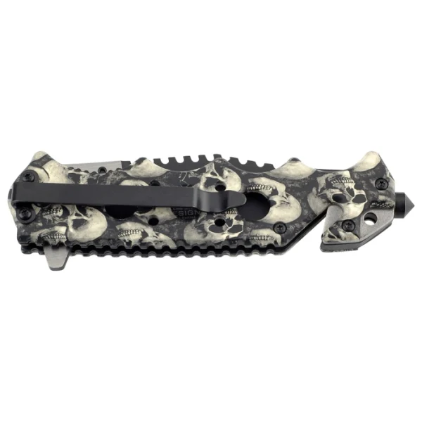 - SPECIAL FEATURES: Spring Assisted, Finger Flipper, Liner Lock, Grey Skull Camo Coated Aluminum Handle with Silver Skull, Rope Cutter, Glass Punch, and Pocket Clip.