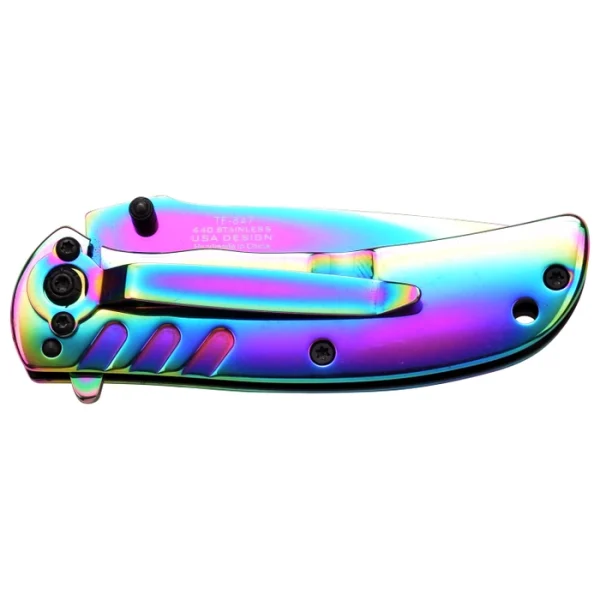 • SPECIAL FEATURES: Spring Assisted, Finger Flipper, Frame Lock, Rainbow TiNite Coated Stainless Steel Handle with Rainbow TiNite Coated Pocket Clip.