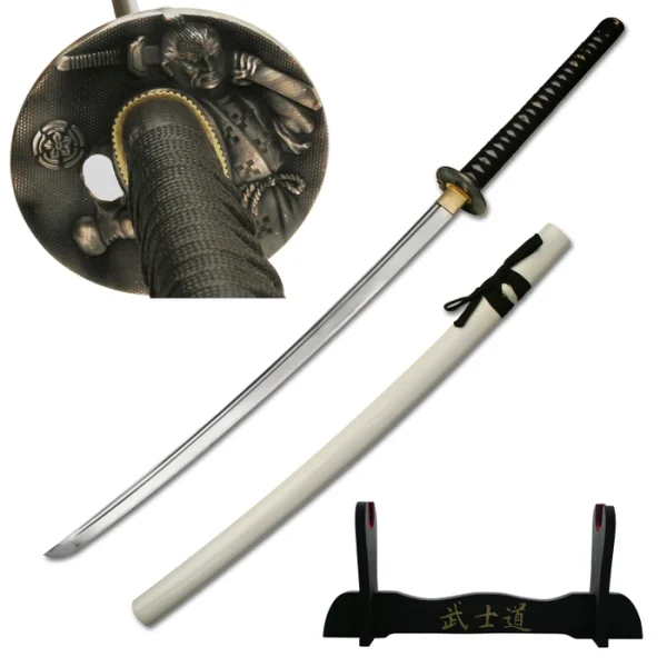 - INCLUDES WHITE LACQUER SCABBARD, SWORD BAG & STAND
